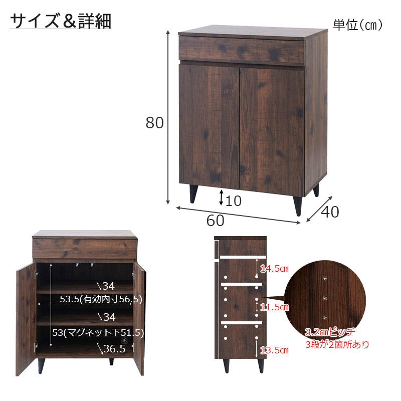 ■引出し内寸/(約)幅53×奥行30.5×深さ7.5(有効9)cm■扉内寸/(約)幅53.5(有効56.5)×奥行36.5(棚板34後部1cm配線用隙間あり)×高さ53(マグネット下51.5)cm