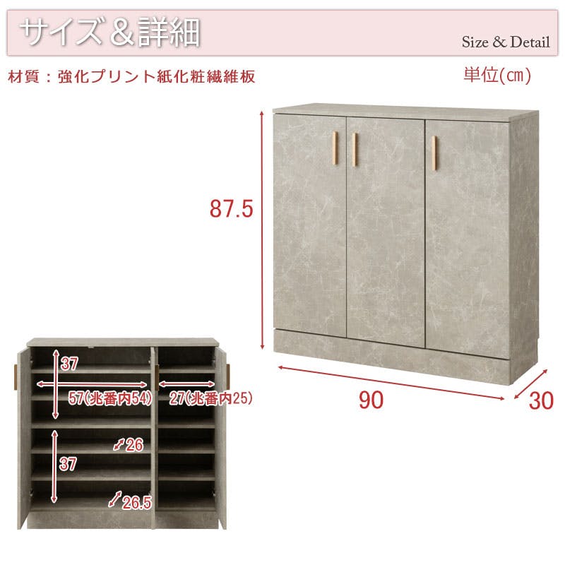 ■扉内寸/左扉内(約)幅57(兆番内54)×奥行26.5(棚板26)×高さ37(固定棚挟み上下共通)cm、右扉内(約)幅27(兆番内25)×奥行26×高さ37(固定棚挟み上下共通)