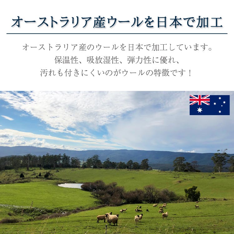素 材:表層 毛羽部分 羊毛100% オーストラリア産ウール グランド部分 ポリエステル90% ポリウレタン10% 下層 中わた部分 ポリエステル100% 生地部分 ポリエステル65% 綿35% 毛 長:約22mm 重 量:シングル約2.8kg セミダブル約3.35kg
