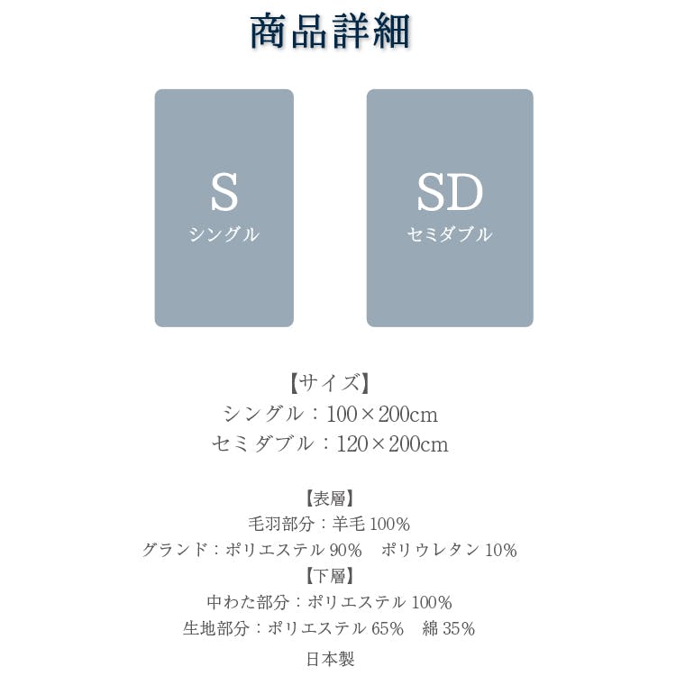 素 材:表層 毛羽部分 羊毛100% グランド部分 ポリエステル90% ポリウレタン10% 下層 中わた部分 ポリエステル100% 生地部分 ポリエステル65% 綿35% 毛 長:約22mm 重 量:シングル約2.8kg セミダブル約3.35kg