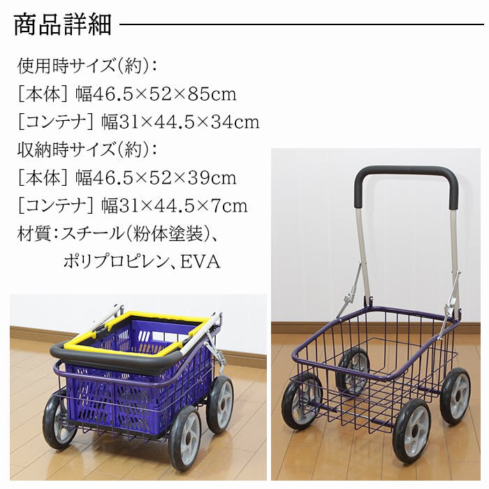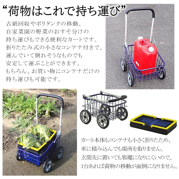 荷物に合わせて使い分けできるコンテナ付き台車。大きな荷物は本体バスケット、小さな荷物は折りたたみコンテナが便利です。
