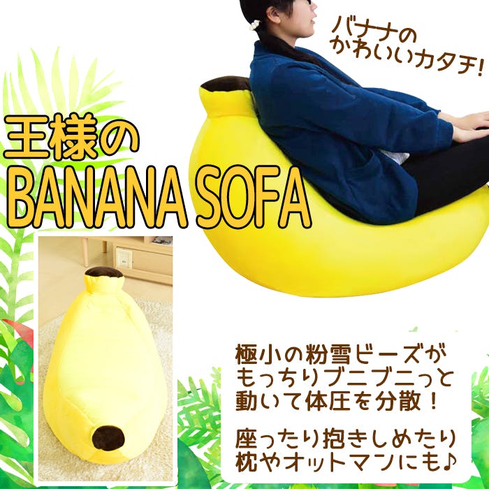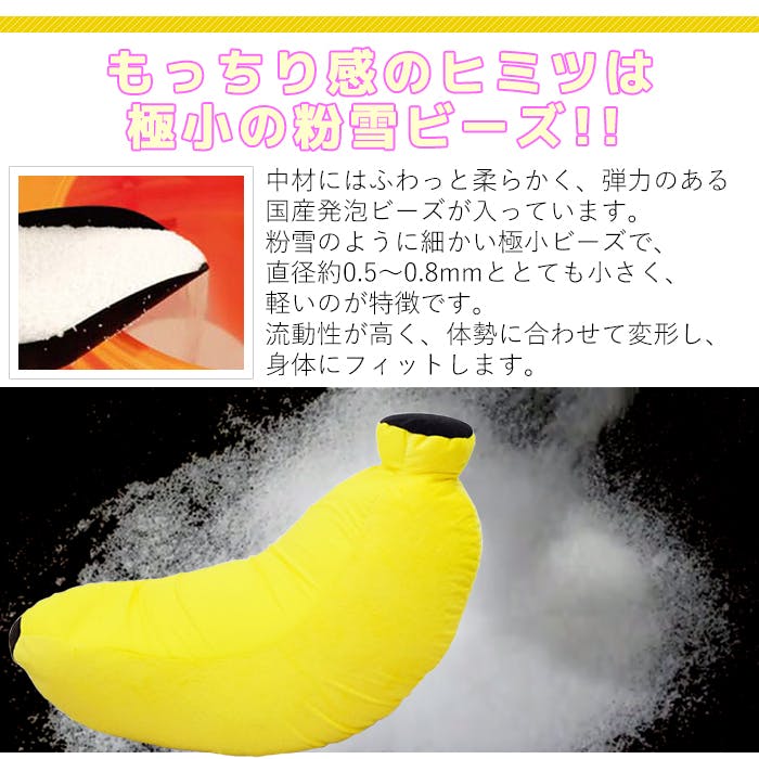 どんな姿勢でも体にフィットするバナナクッション。粉雪のように細かいビーズがもっちり感を実現。座ってもバナナの形が大きく崩れません。