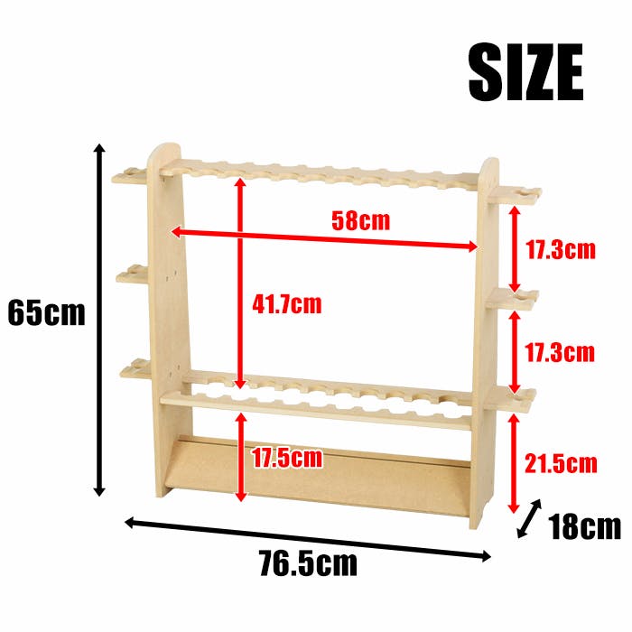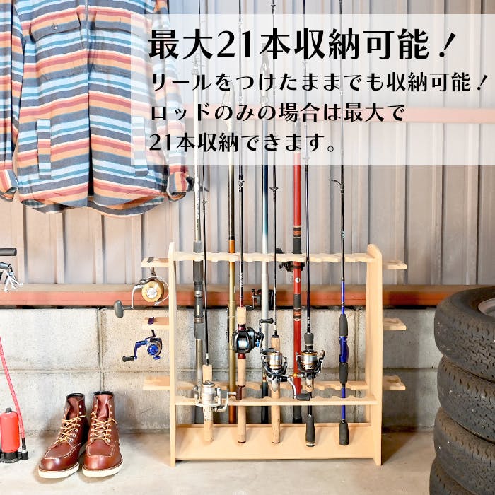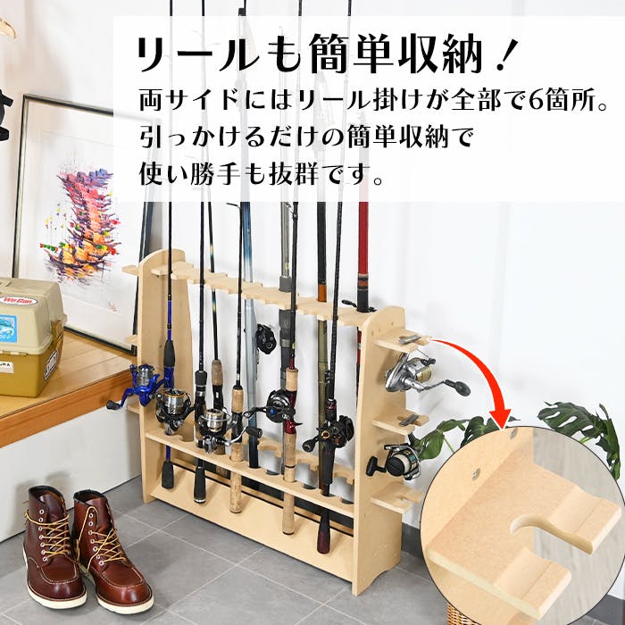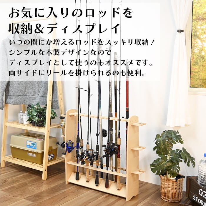 自慢の釣り竿を美しくディスプレイできる釣り竿収納棚。釣り竿を1本1本立てる事ができ、洗った後の竿干しとしても利用できます。立てて収納する事で釣竿の破損を防ぎます。2列収納が可能なので、より多く立てかけることができます。