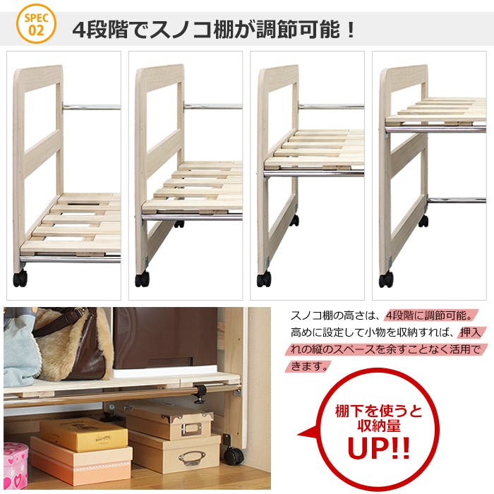 押入れに合わせて横幅を調節できる布団収納ラック。高さ可変のスノコ棚でスペースを有効活用。防湿・防虫効果のある桐材使用で、カビやにおいも防ぎます。 ※新品アウトレット