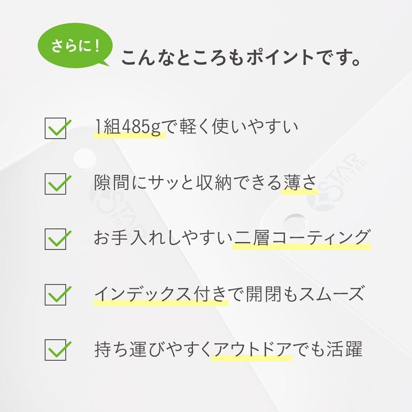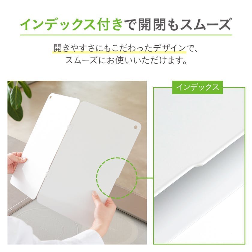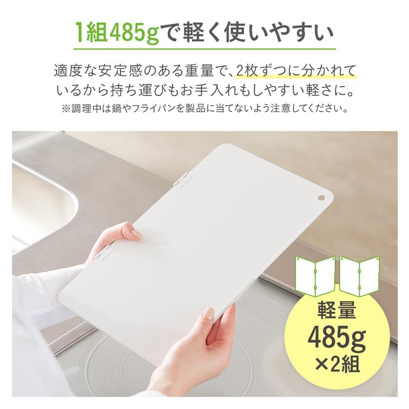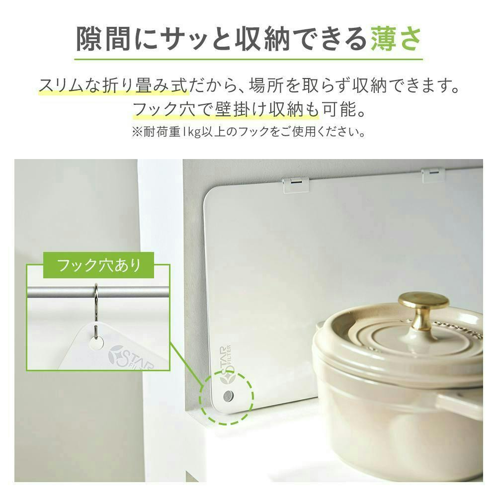 1組あたり約485gと軽量ながら適度な安定感を備えており、2枚ずつに分かれているため持ち運びやお手入れもスムーズです。使わない時は折りたたんで隙間に収納できるスリム設計で省スペースのキッチンにも対応。壁掛けに便利なフック穴も備えています。