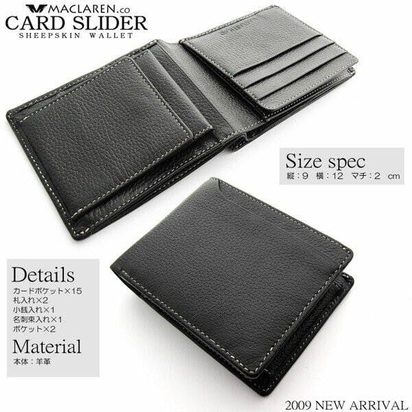 MACLAREN.co 羊革(シープスキン) カードスライダーウォレットの登場です。前面にカードスライドポケットが付いたお洒落な二つ折り財布です。しなやかで肌触りの良い羊革/(シープスキン)を使用しております。カードに特化したデザインで、なんと15枚も収納可能な二つ折り財布。また、扇状に開くカードポケットも有り、名刺などを束で入れることも可能になっております。