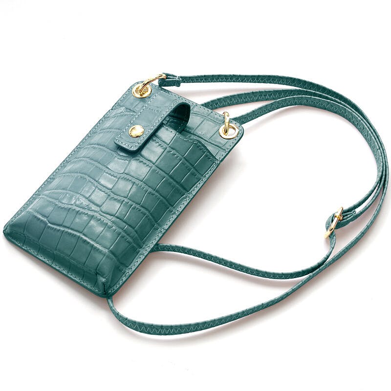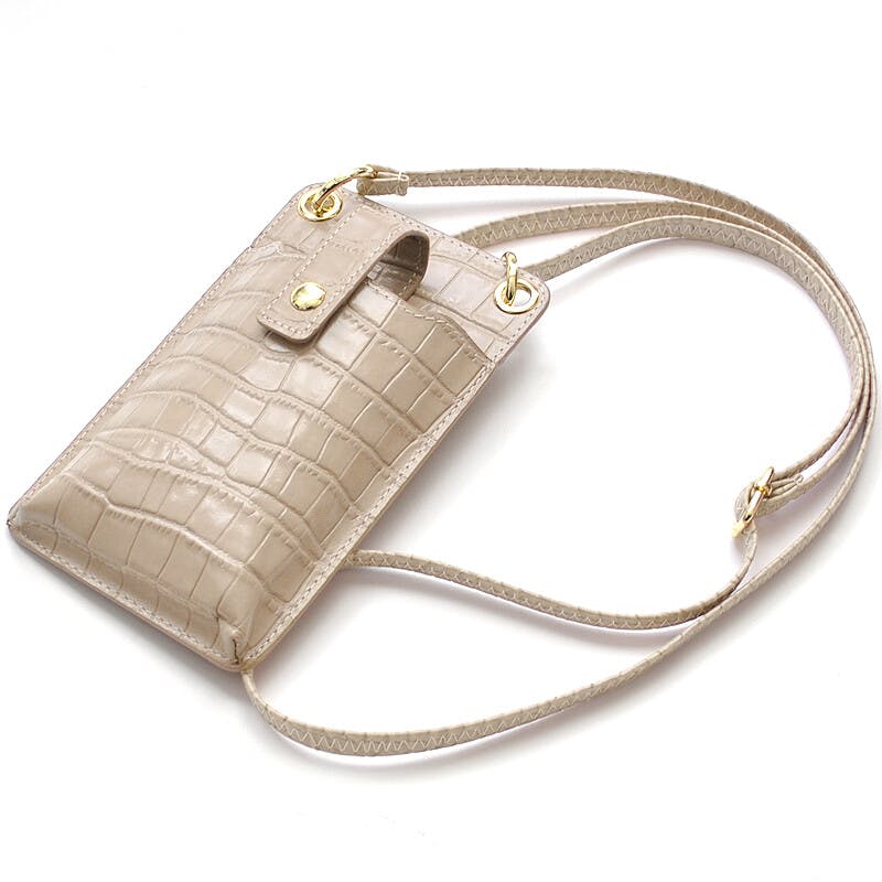 牛革クロコ型押しのスマートフォンショルダーポーチ。iPhone14 Plus(※1参照)サイズまで対応のシンプルなベルトフラップ型のデザインです。ベルトフラップは、使用頻度の高いスマホをスムーズに出し入れできるようにマグネットボタンを採用しています。平面にはカードポケットが付いていますので、nanacoなどのICカードやポイントカードを入れておくと、ID決済派で財布を持ち歩かない方などでも便利にお使い頂けます。ショルダーストラップは着脱式で、長さ調整も可能となっていますので、身長など気にせず