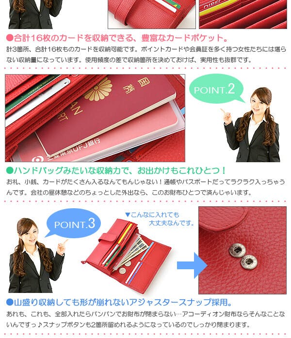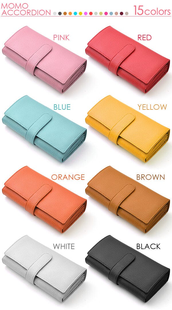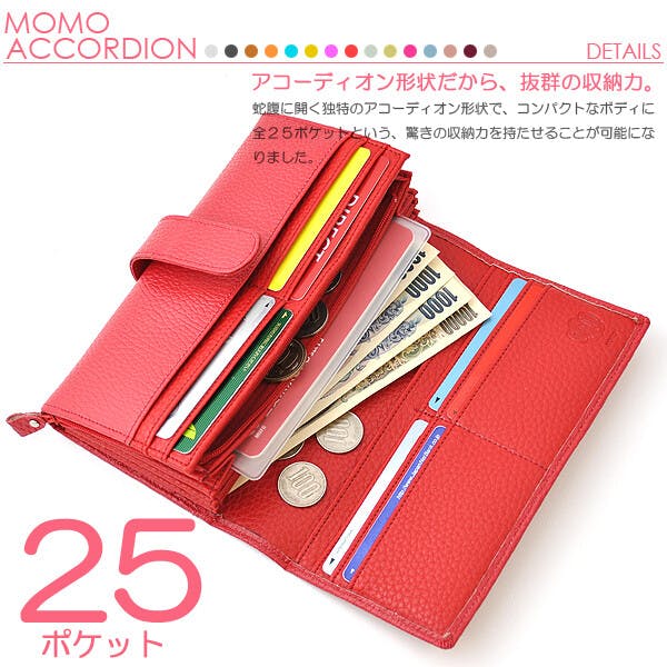 レディース財布で不動の人気を誇るMOMOアコーディオン財布♪全25の収納ポケットを搭載し、通帳なども入る深さ。まさにハンドバッグ級の収納力です♪15色のカラーバリエーションで自分に合ったカラーを選べます。