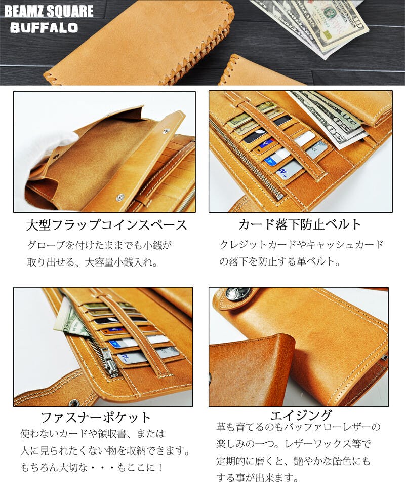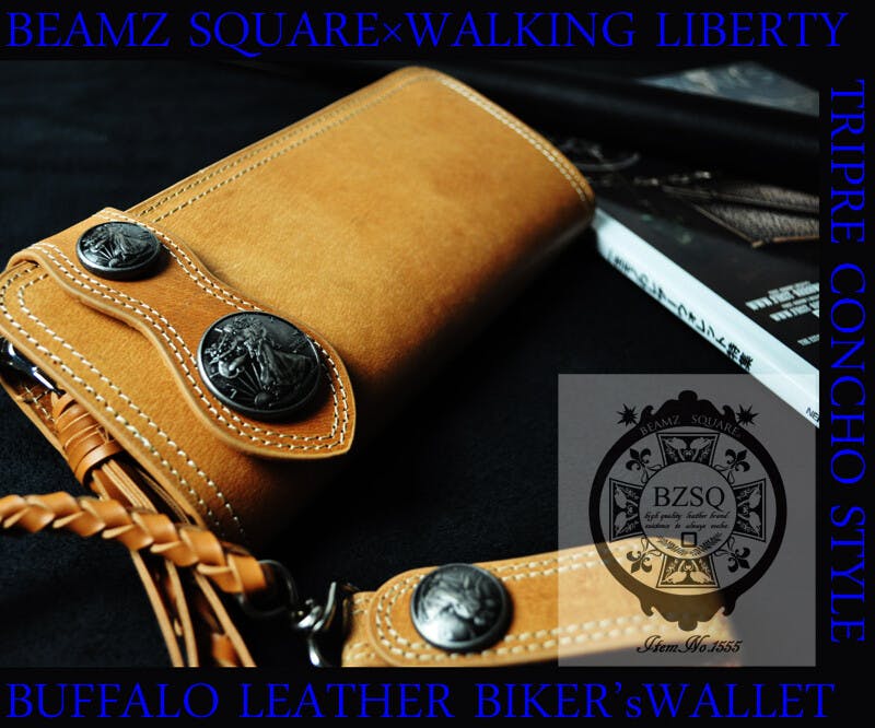 バッファローの素材感を生かしたワイルドでハードな風貌に加え、アメリカの通貨史上、最も美しいコインと評されているウォーキングリバティコインコンチョ(レプリカ)を本体に2個、ウォレットロープのベルトフックに1個の計3個搭載。 そして、硬派な外観を損なわない、充実した内部機能。 バイク乗りに嬉しい大型フラップの大容量コインスペース、カードの落下を防止する革ベルト、そして、使い方自由なファスナーポケット。 すべての拘りを網羅した、ケツポケに似合う珠玉のハイクオリティウォレットです。