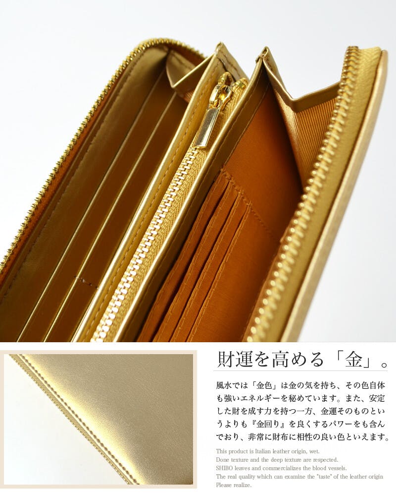 風水の観点では金色の財布は一番人気の金運の色。計画的にお金を使う堅実性が身に付き、財を与える力を持つと言われているゴールドカラーの財布。、金運上昇を期待できる人気のカラーリング。 ファスナー金具もYKK社製のゴールドカラーファスナーを使用しており、高品質ストレスフリーの開閉を実現。小銭入れはL字ファスナーを採用しており蛇腹式に開くので、小銭を取り出しやすい優しい設計。 全てをゴールドに染め上げ、スマートに、そしてスタイリッシュに使いこなせるように細部まで拘りました。