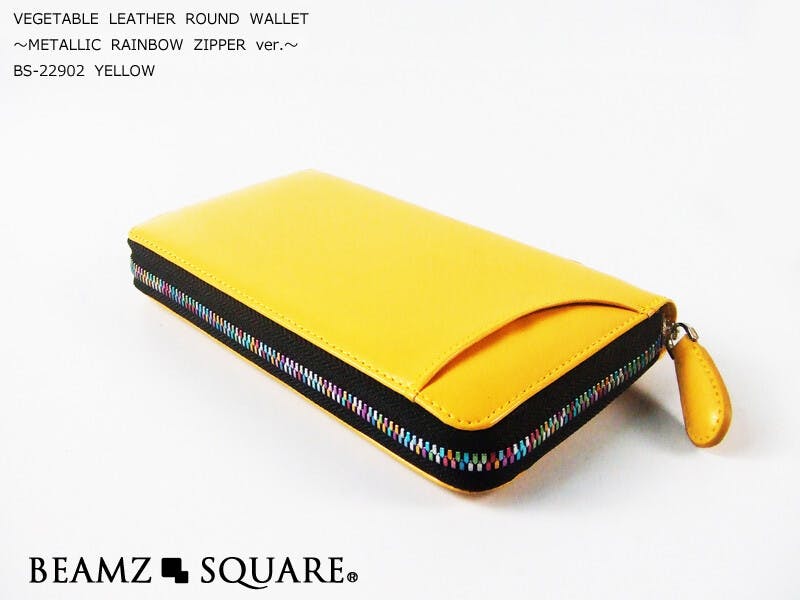 植物性タンニンを使い、丁寧に鞣した極上の牛革素材、ベジタブルレザーを使用した、BEAMZSQUARE ZIPウォレット。 優しい手触りで、使うほどに艶がでて手に馴染んでくるのが特徴の素材で素材本来の良さを最大限に生かした作りです。ラウンドファスナー金具には、カラフルなメタリックレインボーファスナーを使用。開閉もスムーズで、人の眼を惹くカラーリングは必見です。 広く開く3室構造仕様で、収納力も抜群。余裕を持った深め収納は、紙幣はもちろん、パスポートや通帳を入れても ファスナー開閉に手間取りませ