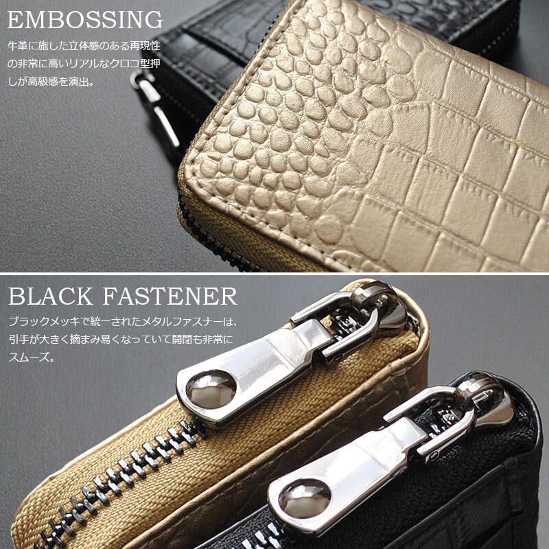 外側にはクロコダイル柄を型押しした、高品質な牛革を使用。風水のベースとなる五行説では、ゴールドは言わずと知れた最強の金運上昇カラー、ブラックは日本の大黒天にも通ずる、蓄財力を高める金運の象徴カラーとされています。ブラックメッキで統一されたメタルファスナーも、本体カラーとの相性が抜群!風水的に金運アップの象徴カラーとされているゴールドをふんだんに使用する事により、気分も上がる高貴でスタイリッシュな仕上がりとなっております。