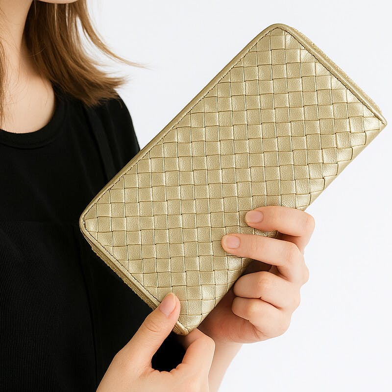 やわらか質感が抜群のシープスキン編み込み仕様♪牛革よりも少しソフトな肌触りの良いふわりとした羊革メッシュを使用したラウンド長財布です。シープレザーは、ライダースやレザージャケットなどにも多く使用されている皮革で、その柔軟性と柔らかな質感が特徴です。センター仕切りのファスナー小銭入れを含めた、五層に広がるラウンド内部デザインでお札やサービス券、金券やレシートなども十分に別けて収納することが可能です。カードポケットもカードが12枚も収納することが出来ますので、クレジットカードやキャッシュカード、