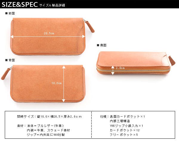 自然から継承された、圧倒的存在感。本体には、牛革の中でも丈夫で耐久性に富んだブルレザーを採用。硬質で耐久性のある素材を選ぶことで財布自体の強度を上げ、品質を永年愛用するに相応しいレベルまで引き上げています。内側には肌触りの良い上質なスエード調素材を採用しており、高級感をより一層引き立てています。ラウンドファスナーを開いて、一番外側の面にはそれぞれ横向きに6枚収納カードポケットを完備。最大計12枚のカードを収納でき、その他フリーポケットをも装備しています。この財布最大の特徴とも言える蛇腹デザイ