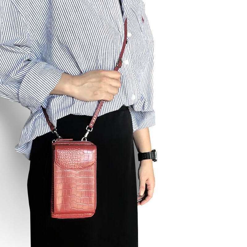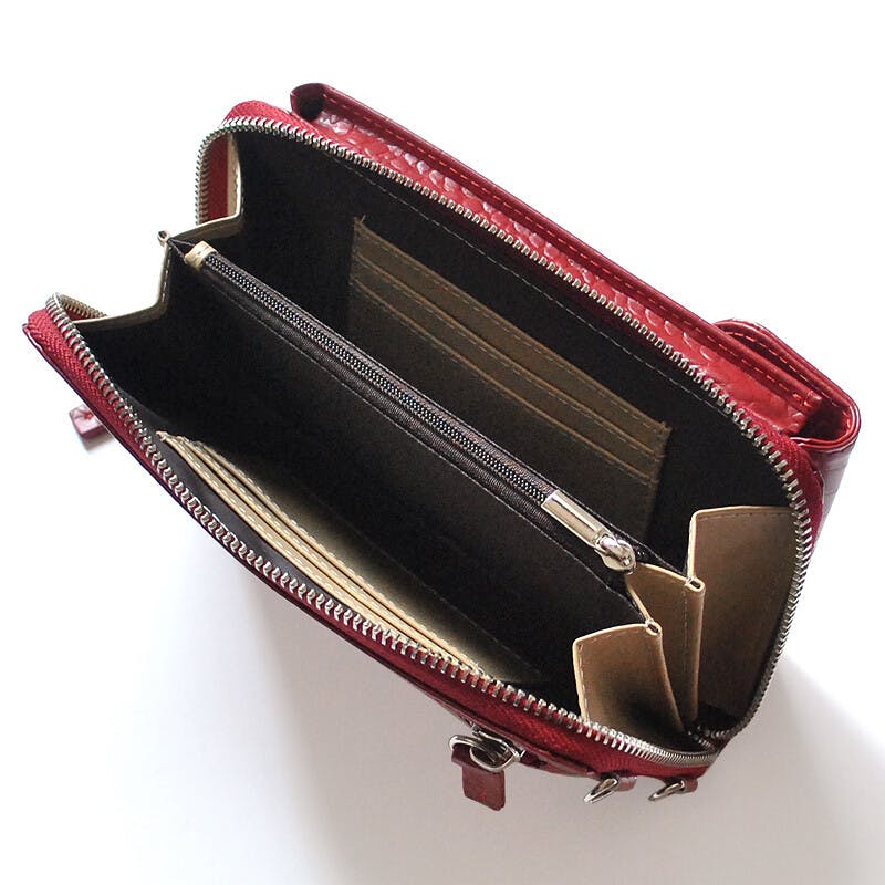 根強い人気のクロコ型押し加工を施した牛革のスマホポーチです。ラウンドファスナータイプの収納と背面のファスナーがお財布の役割をしてくれるので、お財布を持たず、このポーチひとつでお出掛けいただけます。バッグを持って行くほどでもないちょっとしたお出掛けや、旅行先などでの観光の際に非常に便利です。スマホポケットはマチ付きで大きめに作られていますので、スマホ以外のものを収納してお使いいただく事も可能です。また、ショルダー紐は着脱式になっていますので、外してお財布そのものとしてもお使いいただけます。バー