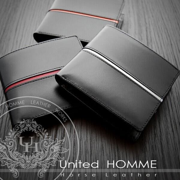 United HOMME 馬革×牛革 センターラインの人気シリーズ、二つ折り財布です。財布本体は一番使いやすくシンプルな造りと色の仕上げで、外側に1本ラインを入れることにより、いっそう目を惹く二つ折り財布です。外側と同じカラーラインを内側にも1本入れることで見えないお洒落も演出しております。