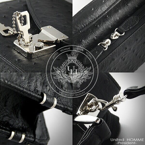 牛革にオーストリッチ型押しを施したUnitedHOMME-President-のコンパクトセカンドバッグ。財布やスマホ等が収納可能な実用性の高いメイン収納と紙幣・小銭・カードが収納可能な財布機能付きの背面ファスナーポケットを完備。バッグと財布の機能を持ち合せた2in1デザインの商品仕様となっています。