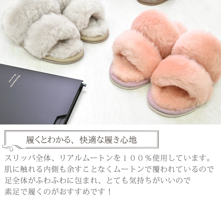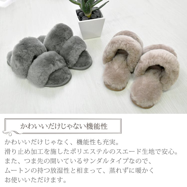 ●甲部分・底部分全てムートンを使用しているふんわり柔らか贅沢な作り●サンダルの底は、すべり止め加工を施しており滑りにくくなっている