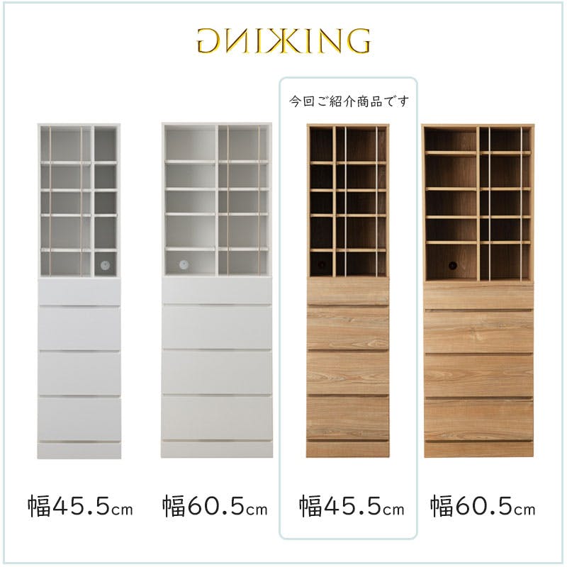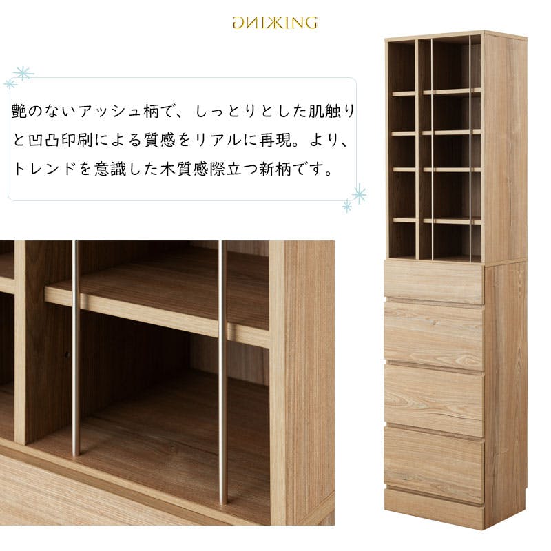 引出し付きで大容量収納ができるオールインワンチェストKINGシリーズが新登場!華やかで清潔感のあるシャンパンゴールドのアクセントパイプ×マットでしっとりとした肌触りと凹凸印刷により天然木のような質感をリアルに再現、よりトレンドを意識した木質感際立つ新柄アッシュナチュラルの絶妙コンビ。引出しは、しっかりと収納ができるように無駄のない構造となっており、沢山収納する事ができます。