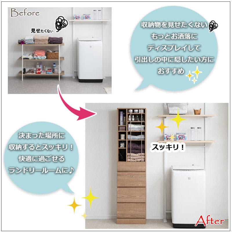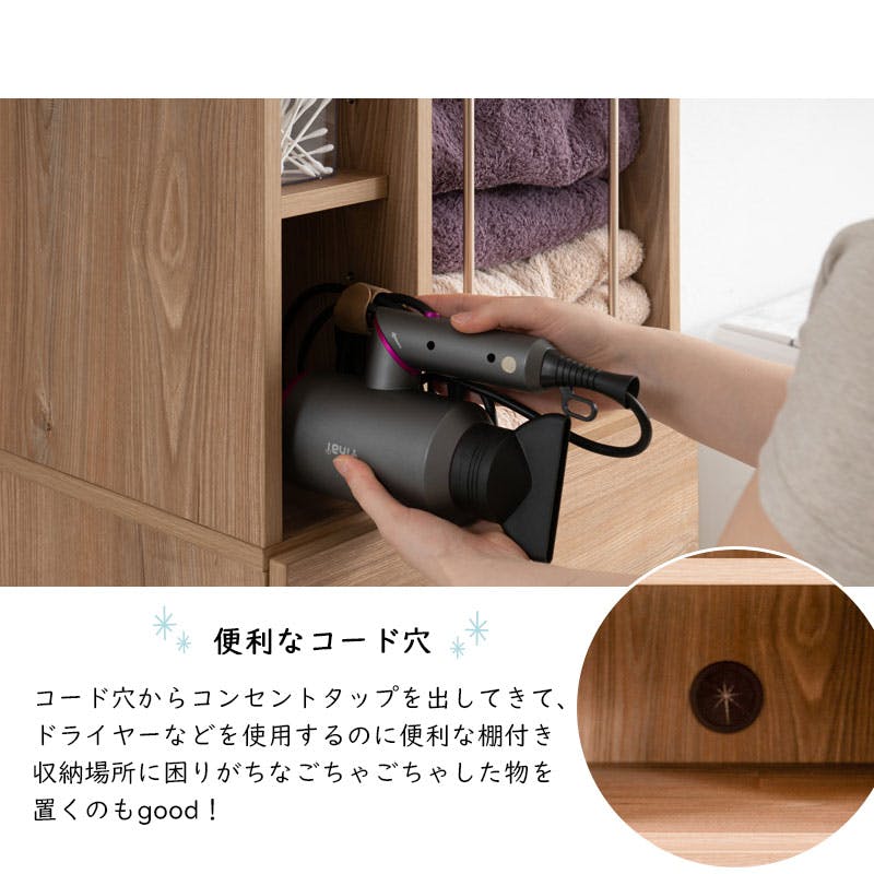 た、家族1人1つの引出しを使い分けてこれ1台に収納する使い方も◎。引出しは深さがあるので、パジャマや下着など着替え、おやすみグッズの収納に最適。オープンラック部分は毎日の使用頻度の高いモノや化粧品などディスプレイ効果があるモノを飾ってもよし。アクセントパイプは積みあがったタオルの転倒を防ぐ役割に加え、デザイン性もアップ。アクセントパイプは不要であれば付けずに組み立てることもできます。