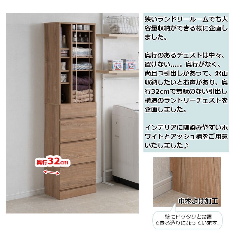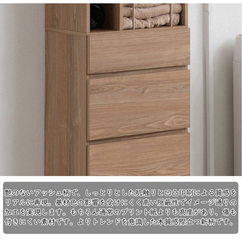 【KING】 ランドリーチェスト 幅45.5 奥行32 高さ180 cm アッシュナチュラル 省スペース 洗面所 ランドリールーム シンプル おしゃれ オープン棚 台 引出し 引き出し チェスト 衣類収納 タオル収納 脱衣所 ランドリーラック オープン 木製 ナチュラル