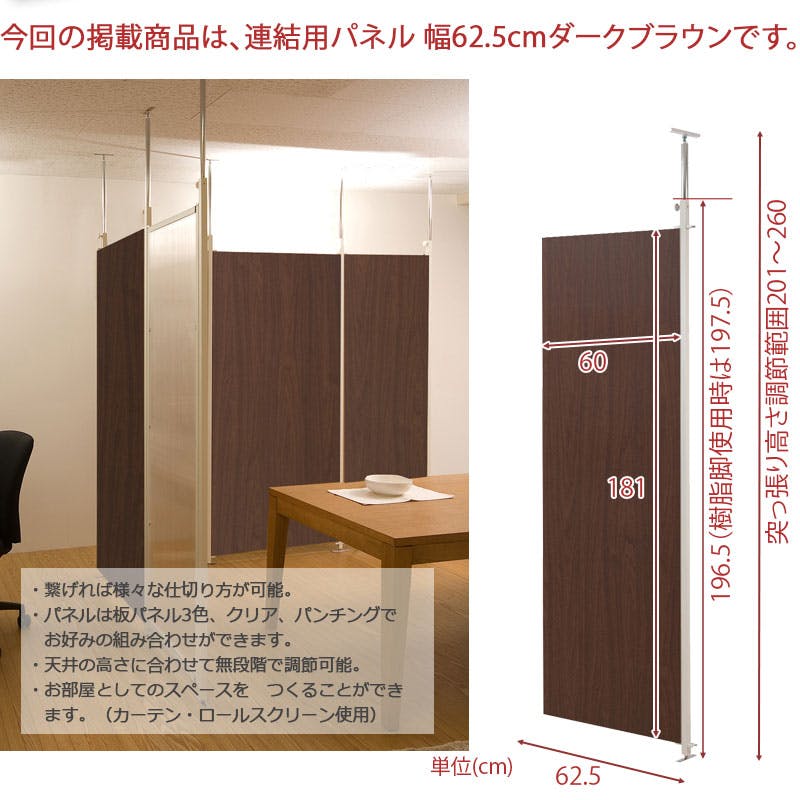 並べて使うことができる間仕切り突っ張りパーテーション 連結用 幅62.5cm ブラウン パーテーション 衝立 家具 事務所 オフィス 仕切り 商談スペース 日本製