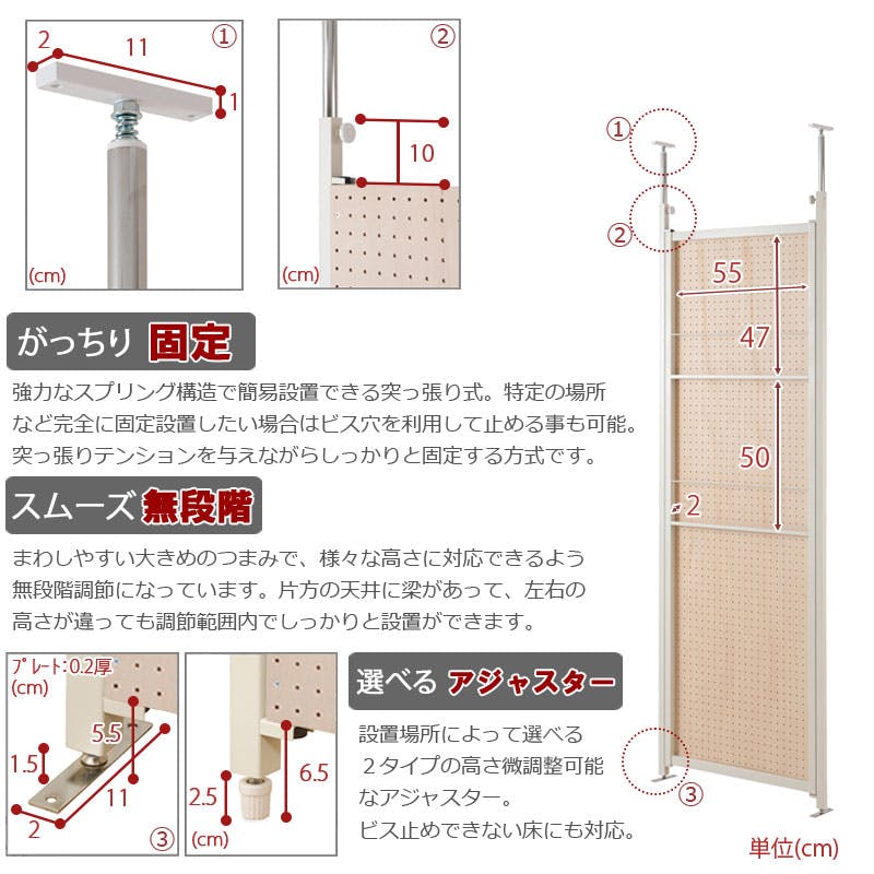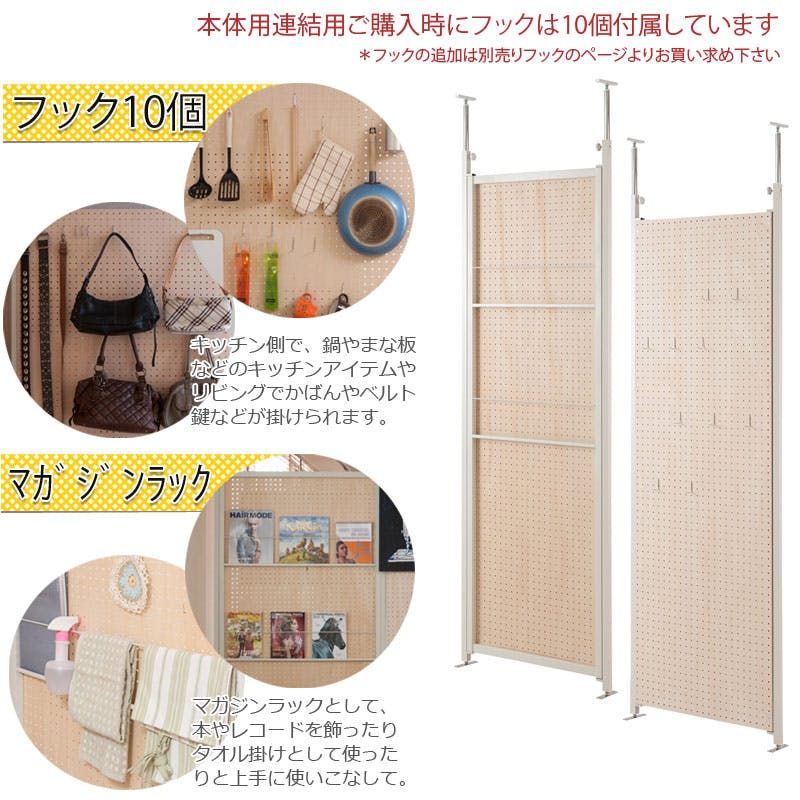 ■商品サイズ/本体:(約)幅65×奥行2.5(上下T字部11)×高さ201~260cm、目隠し部高さ(地面より)186.5cm、マガジンラック部:(約)幅55×奥行2×高さ(上)47(下)50cm■有孔ボード詳細/有孔間隔:(約)2.5cm、穴径:(約)0.5cm、フック出幅(約)3.5cm■付属品/フック10個■商品重量/(約)12kg■日本製■お客様組立品