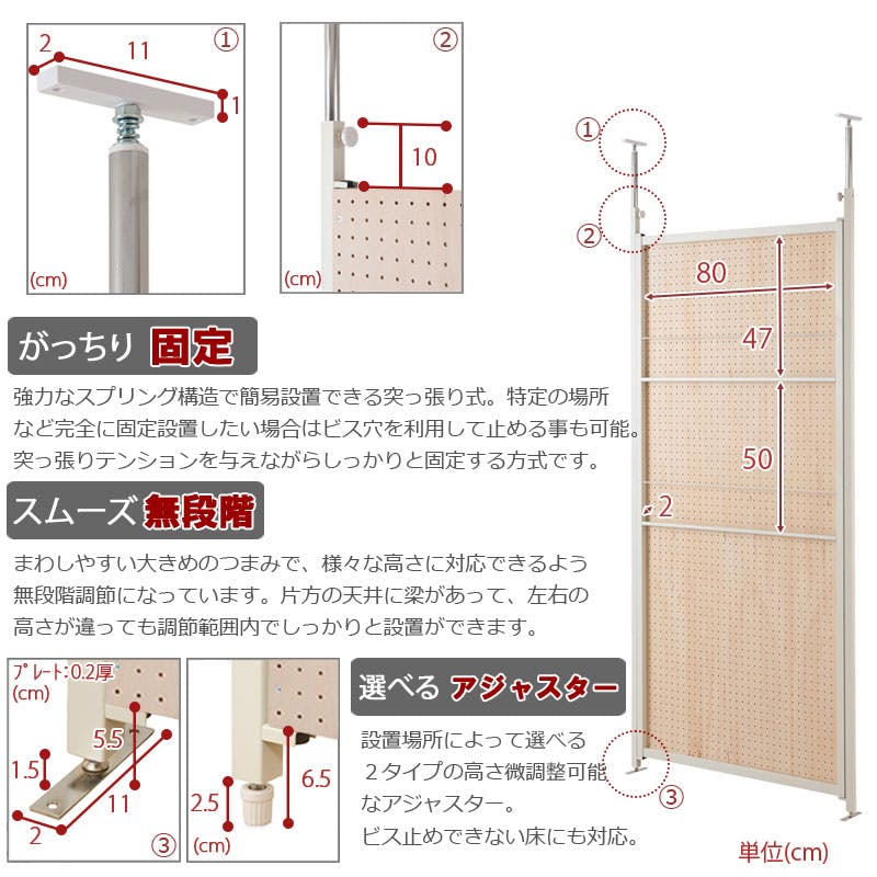 ■商品サイズ/本体:(約)幅90×奥行2.5(上下T字部11)×高さ201~260cm、目隠し部高さ(地面より)186.5cm、マガジンラック部:(約)幅80×奥行2×高さ(上)47(下)50cm■有孔ボード詳細/有孔間隔:(約)2.5cm、穴径:(約)0.5cm、フック出幅(約)3.5cm■付属品/フック15個■商品重量/(約)17kg■日本製■お客様組立品