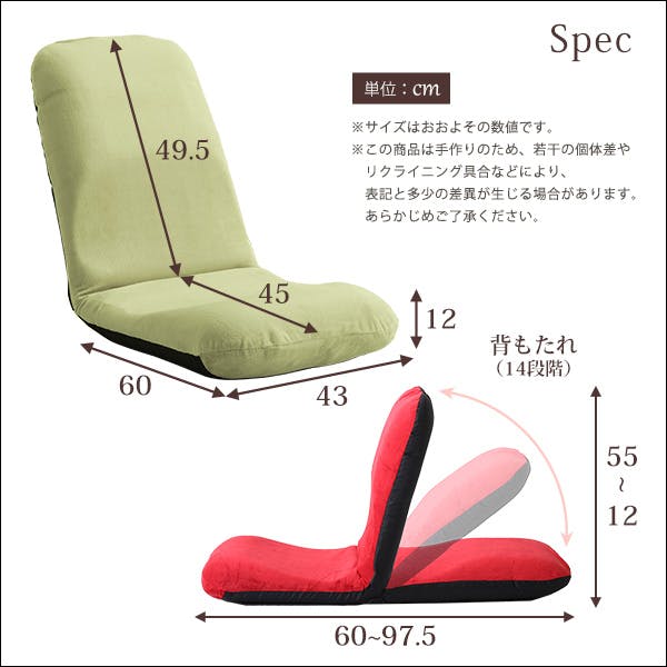 【商品について】 美姿勢習慣、コンパクトなリクライニング座椅子(Lサイズ)日本製 Leraar-リーラー- ■サイズ: 外寸:(約)幅43x奥行き60~97.5x高さ12~55cm(座面高:12cm) ※商品重量:(約)4kg ■カラー: 起毛タイプ: グリーン、レッド、ピンク、ベージュ、ブラウン メッシュタイプ: ブラック、ブルー、レッド ■素材: 表地:ポリエステル構造部材:スチールパイプ クッション材:ウレタンフォーム ■その他: ・完成品でのお届けです。 ・梱包サイズ:(約)43x