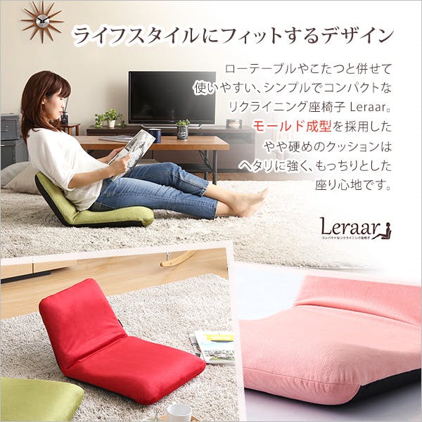 【商品について】 美姿勢習慣、コンパクトなリクライニング座椅子(Mサイズ)日本製 Leraar-リーラー- ■サイズ: 外寸:(約)幅42x奥行き53.5~83.5x高さ11~45cm(座面高:11cm) ※商品重量:(約)3kg ■カラー: 起毛タイプ: グリーン、レッド、ピンク、ベージュ、ブラウン メッシュタイプ: ブラック、ブルー、レッド ■素材: 表地:ポリエステル 構造部材:スチールパイプ クッション材:ウレタンフォーム ■その他: ・完成品でのお届けです。 ・梱包サイズ:(約)4