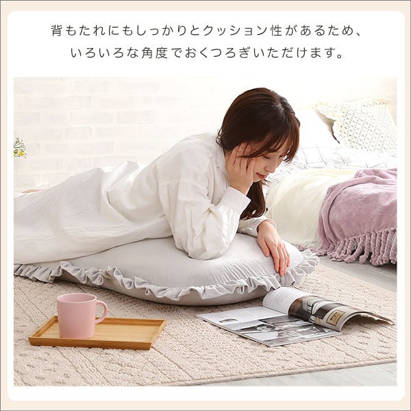 【素材】 張地:ポリエルテル 100% 構造部材:スチールパイプ 中身:ウレタンフォーム 【商品サイズ】 W52XD66-96XH18-48cm(フリル幅5cm含まず) 【商品重量】 4.3kg 【梱包サイズ】 50X50X58cm 【梱包重量】 5kg 【生産国】 日本 【カラー】 ピンク(PK)、グリーン(GR)、グレー(GY)、ベージュ(BE)ホワイト(WH) 【その他】 完成品