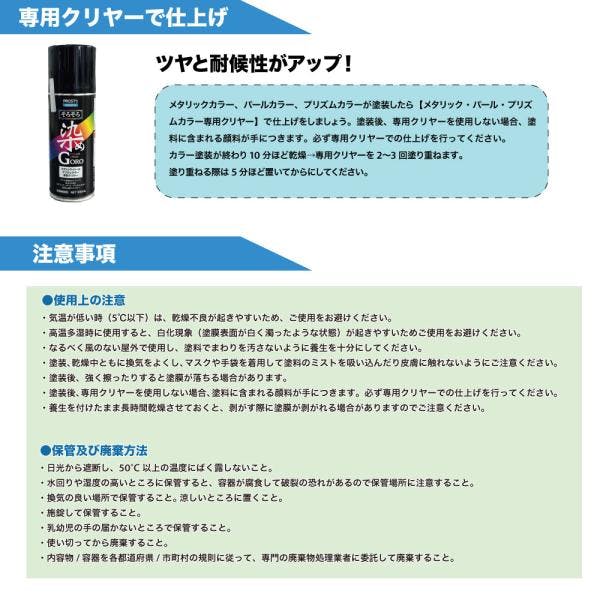 ■専用クリーナーで脱脂:塗装面の油分や汚れを落とす際に使用します。塗装前の下地処理に使用します。■専用プライマーで下塗り:上塗りとの密着力を上げます。プライマー処理が必要な素材に使用します。詳しくは図に記載してあります適応表をご確認ください。■専用クリヤーで仕上げ:染めGOROシリーズのメタリック、パール、プリズムカラーの仕上げに使用します。塗装後、専用クリヤーを使用しないと塗料に含まれる顔料が手につきますので必ず専用クリヤーでの仕上げを行なってください。