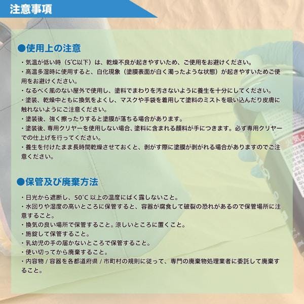 ●吸い込みの多い布地や、スエードなどの毛足の長い素材に厚く塗り重ねると、ごわつきが出ることがあります。●気温が低い時(5℃以下)は、乾燥不良が起きやすいため、ご使用をお避けください。●高温多湿時に使用すると、白化現象(塗膜表面が白く濁ったような状態)が起きやすいためご使用をお避けください。 ●なるべく風のない屋外で使用し、塗料でまわりを汚さないように養生を十分にしてください。 ●塗装、乾燥中ともに換気をよくし、マスクや手袋を着用して塗料のミストを吸い込んだり皮膚に触れないようにご注意ください。