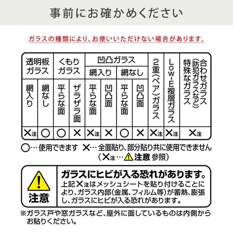 約700g 【生産国】インドネシア 【カラー】クリア 【その他】組立時間目安:約60分~(設置環境・枚数による)  ・室温及び、貼り付ける面が約5℃以下または  35℃以上の場合での貼り付け作業はお避けください。 ・水が直接かかる浴室内のガラス戸などにはご使用出来ません。 ・車のガラスには使用しないでください。 ・飛散防止効果はありません。 ・不要になった保護フィルムは、滑りやすいのでご注意ください。 ・廃棄の際はお住まいの各自治体の処理方法に従ってください。