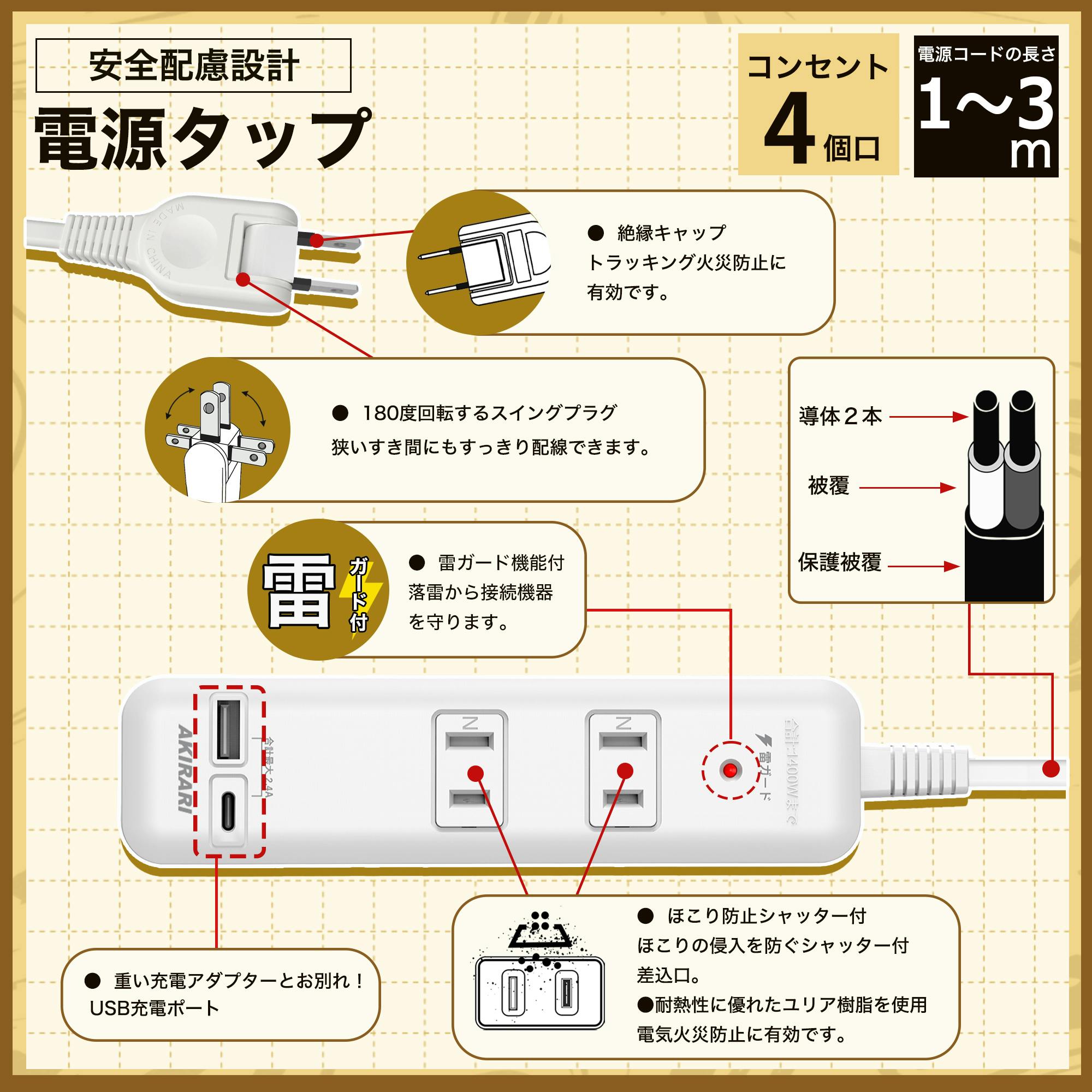 コンセント カバー 延長コード 3m 短い 電源コード コンセントガード ほこりシャッター コンセント タップ 4個口 OAタップ安全 ベビーガード 電源タップ usb たこあしコンセント テーブルタップ 2個AC 1個USB-A 1個TYPE-C oa type-c タコ足配線 蛸足 隙間