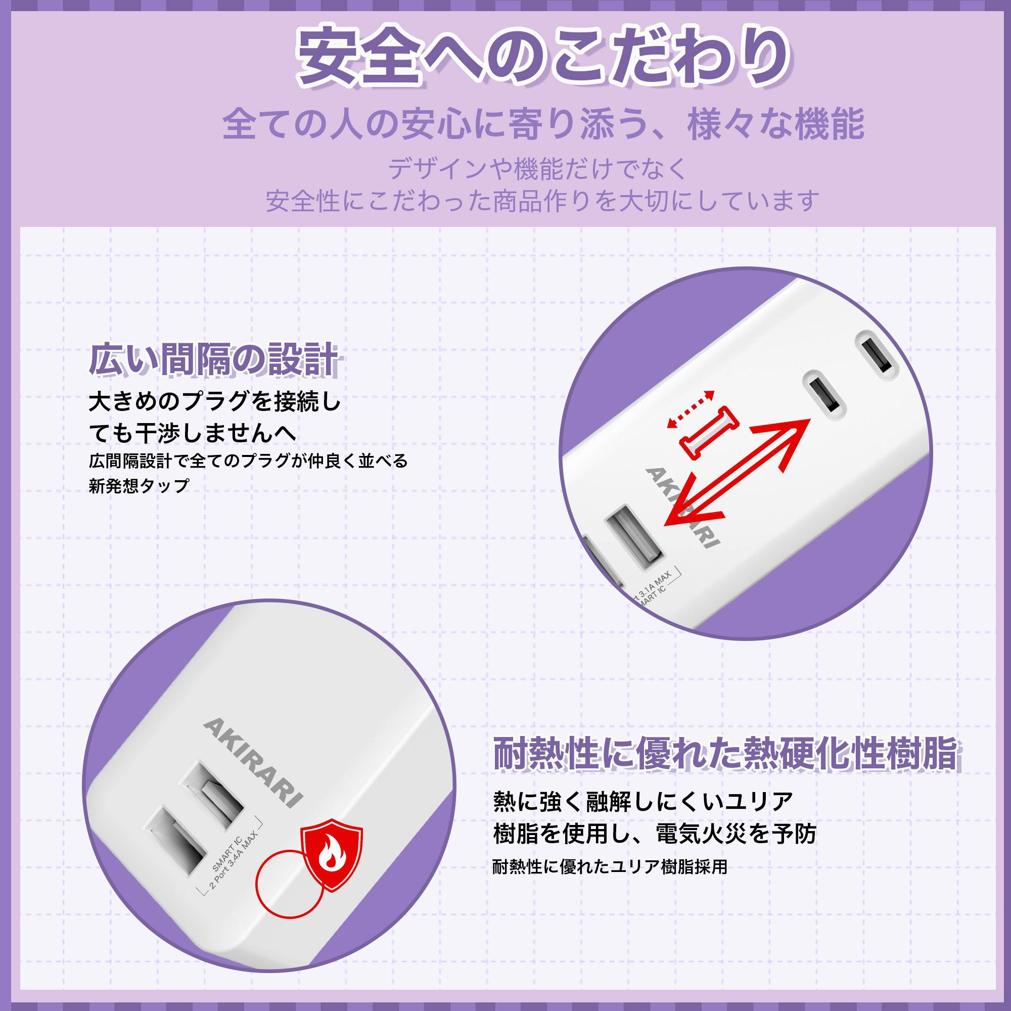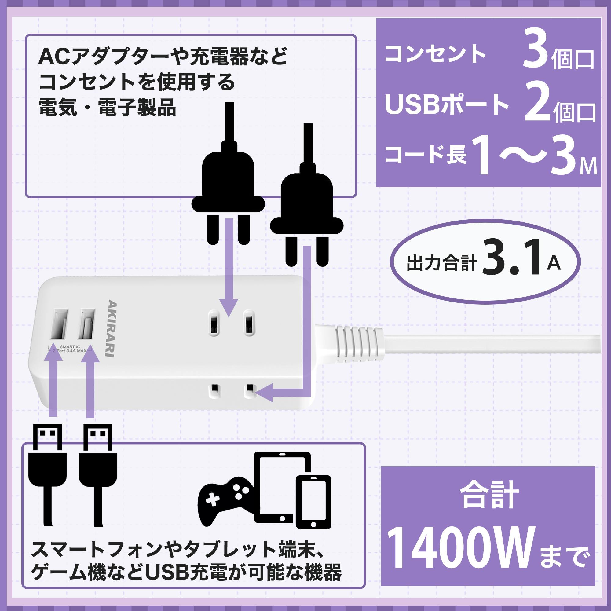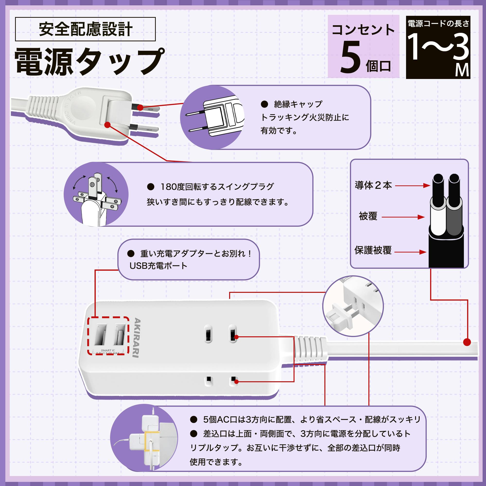 コンセント 延長コード 1m 短い 電源コード タップ 5個口 OAタップ安全 電源タップ usb たこあしコンセント テーブルタップ 3個AC 2個USB-A タコ足配線 蛸足 隙間 薄型