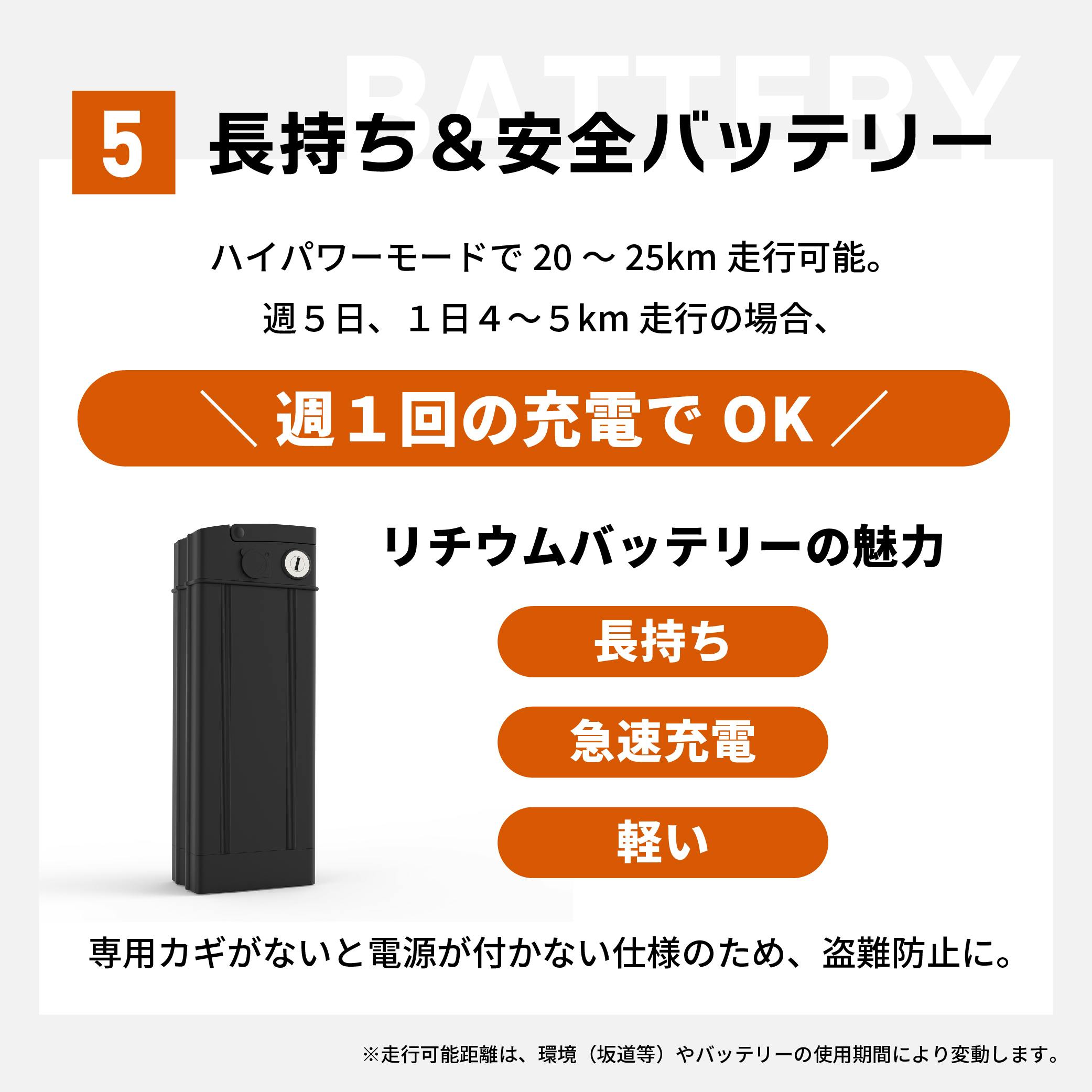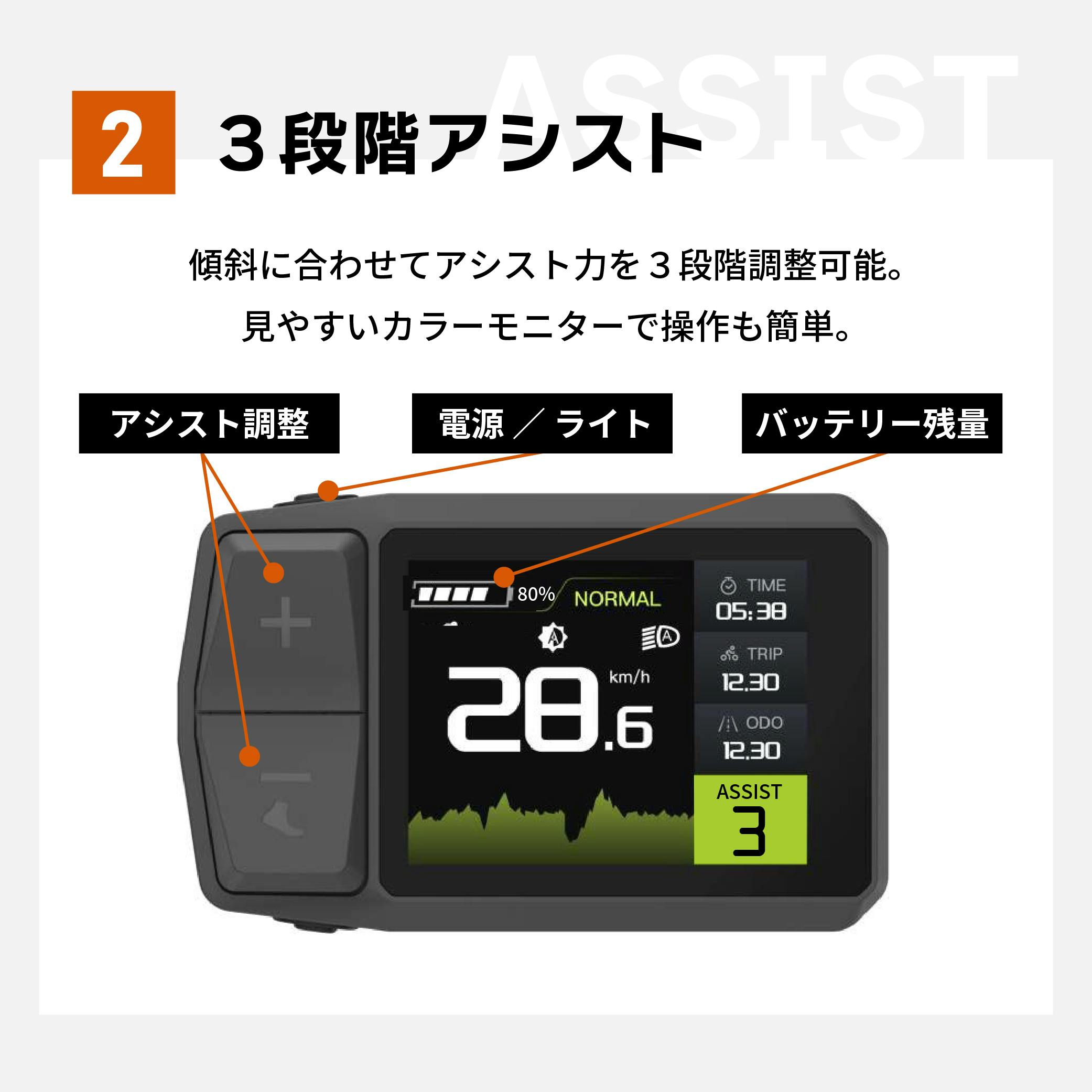 エコモード(アシストレベル1-2):50Kmミドルモード(アシストレベル3):35Kmハイパワーモード(アシストレベル4-5):25Km