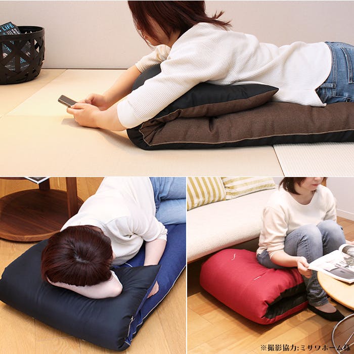 ふかふかの座り心地で、ゆったり座れる長座布団。座ったり、寝転んだり、壁に当てて座椅子代わりにしたり、幅広くお使いいただけます。わたのヨレ・ズレ防止のための和止めが6か所に施してあります。シンプルな無地のカラーなので、和室・洋室を選ばずご使用いただけます。(裏面は黒のナイロン系生地となっております)