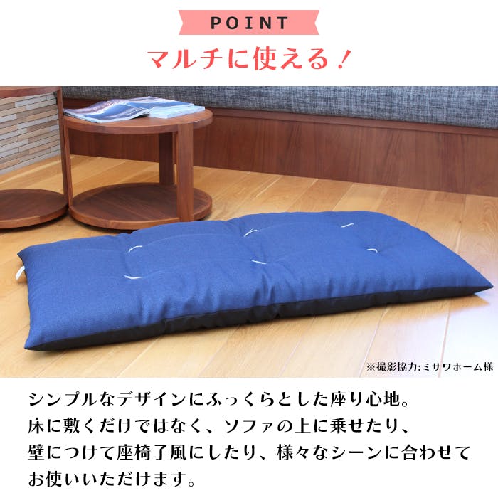 ふかふかの座り心地で、ゆったり座れる長座布団。座ったり、寝転んだり、壁に当てて座椅子代わりにしたり、幅広くお使いいただけます。わたのヨレ・ズレ防止のための和止めが6か所に施してあります。シンプルな無地のカラーなので、和室・洋室を選ばずご使用いただけます。(裏面は黒のナイロン系生地となっております)
