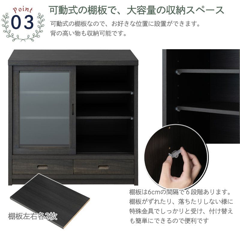■商品サイズ/本体:(約)幅90.5×奥行38×高さ87cm■扉内寸/(約)幅(左右内寸共通)41×奥行30.5(棚板29cm)×高さ62cm■引出内寸/(約)幅38×奥行31×深さ9cm■棚板/可動式:4枚(6cmピッチ・6段階)■耐荷重量/天板:(約)10kg、棚板:(約)5kg■重量/(約)28kg■日本製■完成品(1個口でお届け)