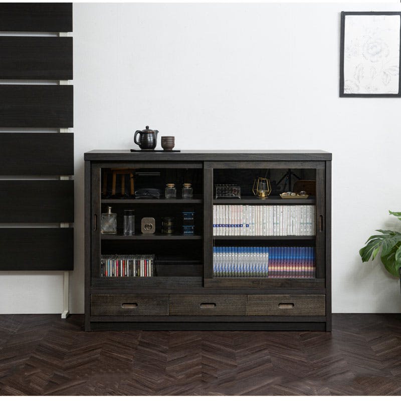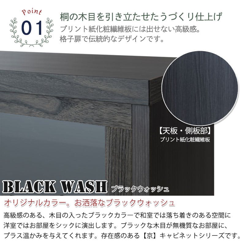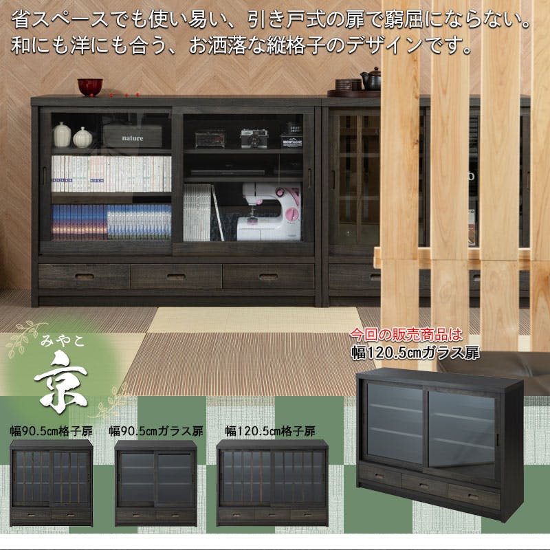 【京】 幅120.5 奥行38 高さ87 ガラスタイプ ブラック 桐 完成品 日本製 国産 キャビネット A4 A4収納 リビング うづくり仕上げ 木目 木製 引戸 引き戸 省スペース 和風キャビネット 収納 引き戸 ディスプレイ棚 モダン 和 みやこ