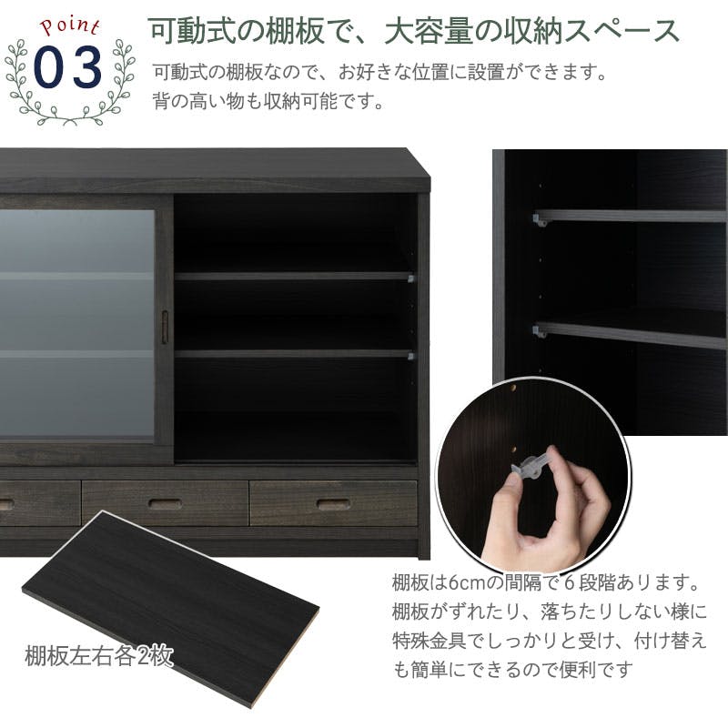 ■商品サイズ/本体:(約)幅120.5×奥行38×高さ87cm■扉内寸/(約)幅(左右内寸共通)56×奥行30.5(棚板29cm)×高さ62cm■引出内寸/(約)幅(左右)34(中)33×奥行31×深さ9cm■棚板/可動式:4枚(6cmピッチ・6段階)■耐荷重量/天板:(約)10kg、棚板:(約)5kg■重量/(約)37kg■日本製■完成品(1個口でお届け)