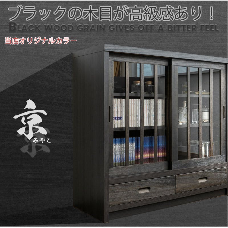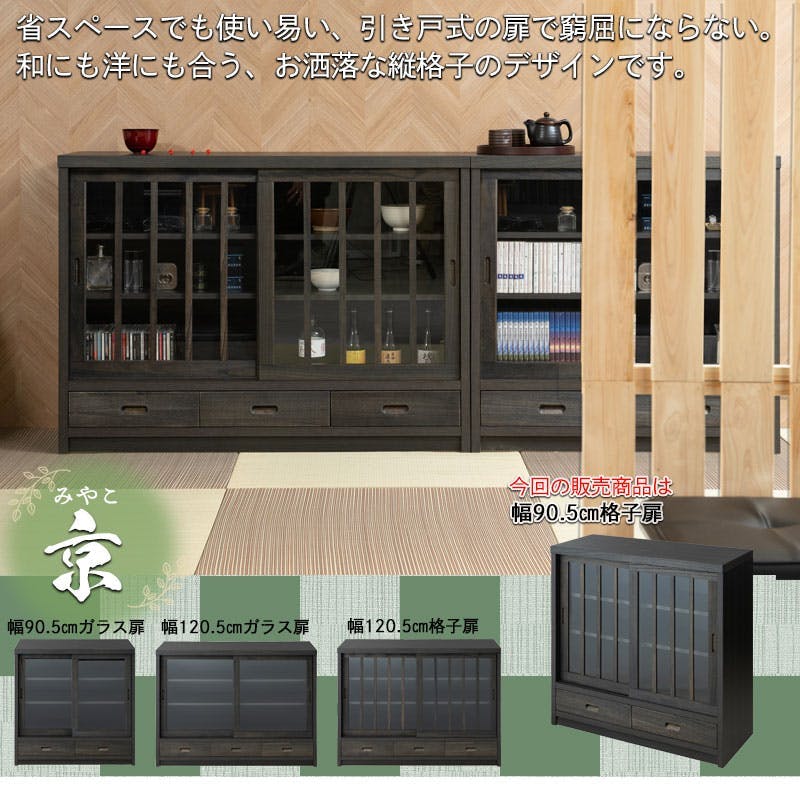 【京】 幅90.5 奥行38 高さ87cm 格子タイプ ブラック 桐 完成品 日本製 国産 キャビネット A4 A4収納 リビング うづくり仕上げ 木目 木製 引戸 引き戸 省スペース 和風キャビネット 収納 引き戸 ディスプレイ棚 モダン 和 みやこ