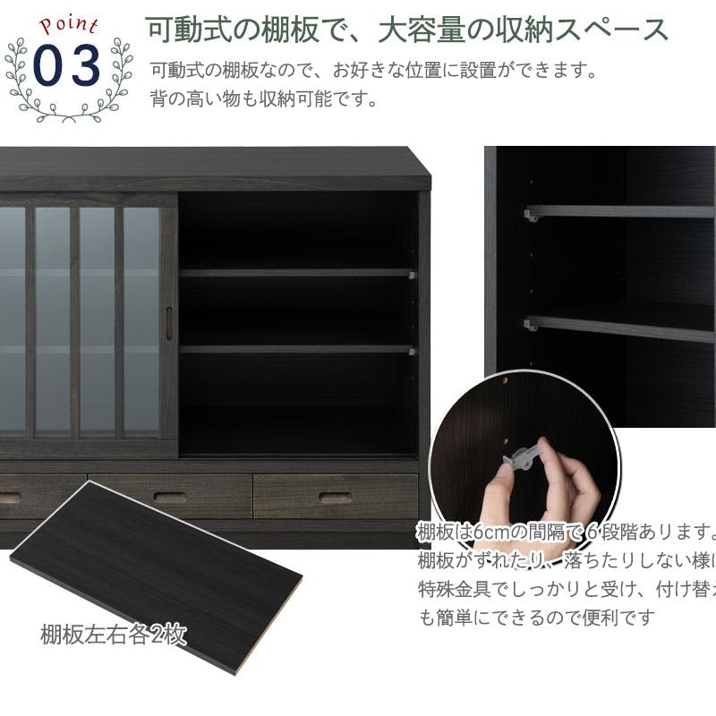 ■商品サイズ/本体:(約)幅120.5×奥行38×高さ87cm■扉内寸/(約)幅(左右内寸共通)56×奥行30.5(棚板29cm)×高さ62cm■引出内寸/(約)幅(左右)34(中)33×奥行31×深さ9cm■棚板/可動式:4枚(6cmピッチ・6段階)■耐荷重量/天板:(約)10kg、棚板:(約)5kg■重量/(約)37kg■日本製■完成品(1個口でお届け)