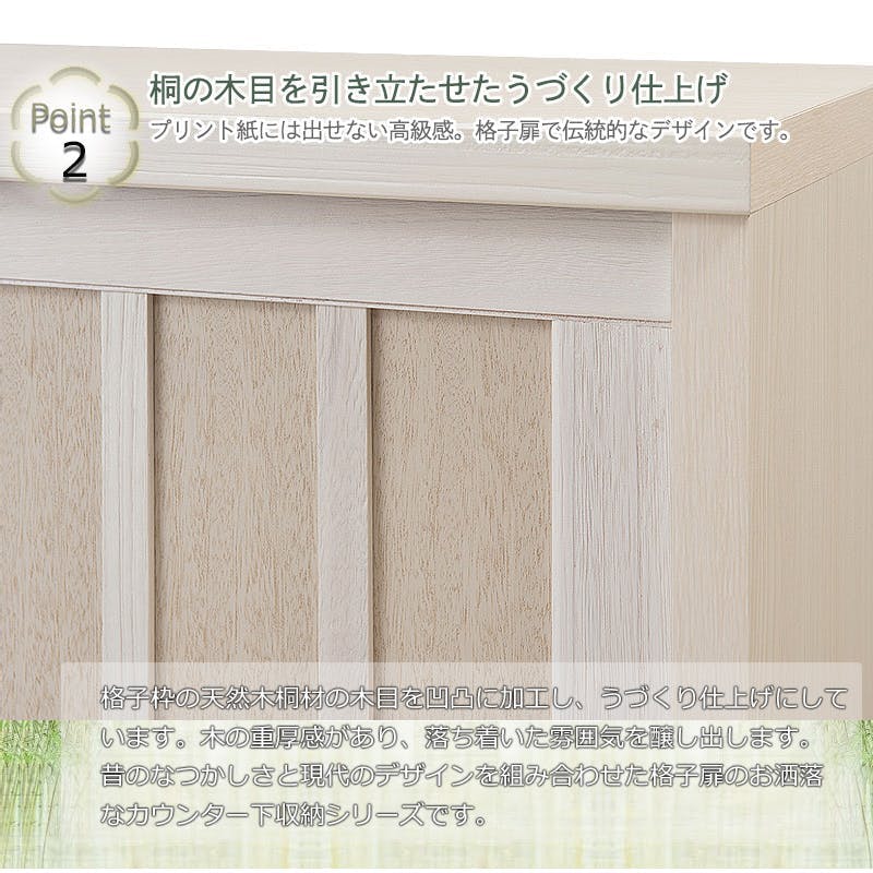 【Tatis】幅120.5 奥行30 高さ86.5 天然木桐材の格子引戸キャビネット カウンター下収納 キッチン収納 ホワイト 日本製 国産 完成品 木製 桐