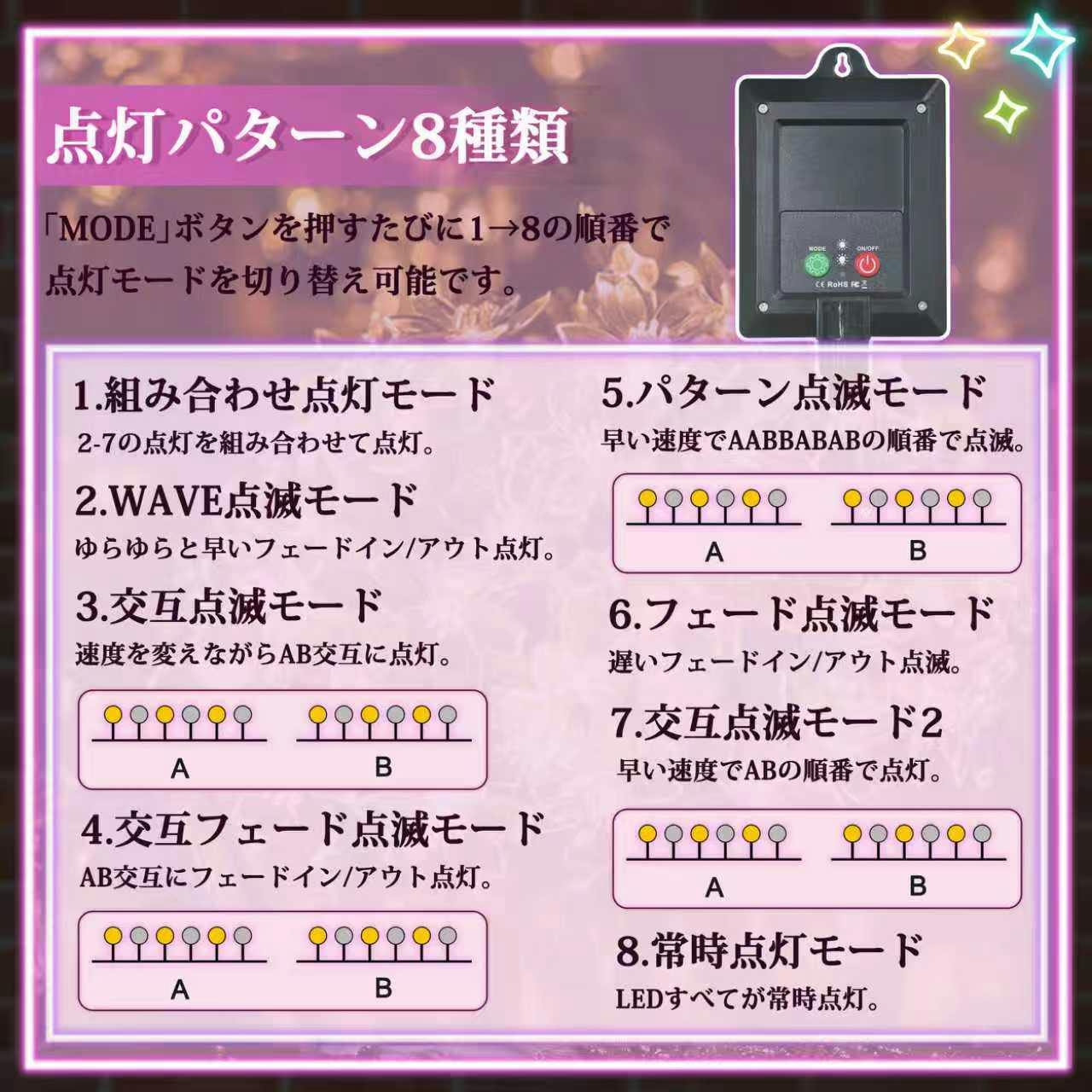 イルミネーションライト 11m 62球 防水 LED 桜 コントローラー付 点滅モード 屋外 クリスマス 電球色 自動点灯 太陽光充電 壁 4色ミックス(赤黄緑青)