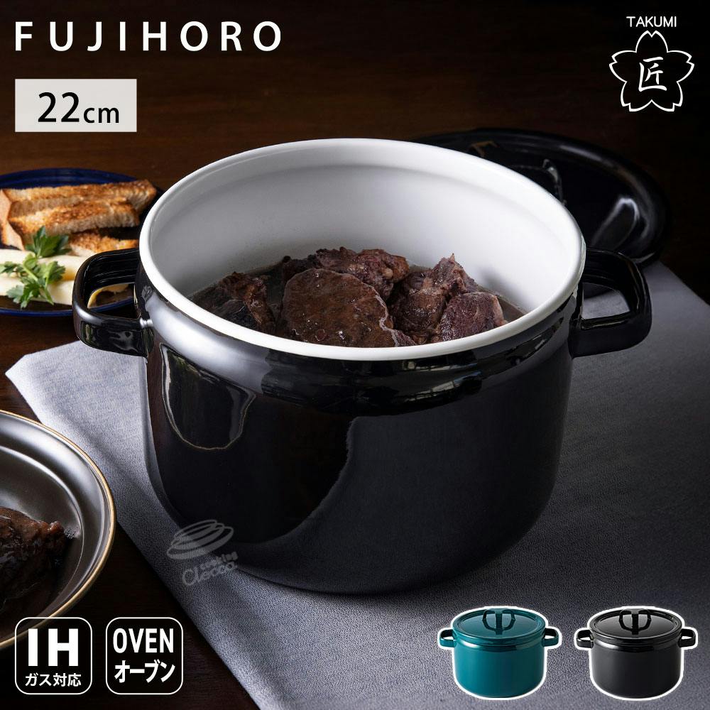 富士ホーロー 匠シリーズ 深鍋 22cm 5.6L 深型 両手鍋 ホーロー フタ付き ガス火 IH対応 TKM-22DW 鉄緑 鉄黒【琺瑯 蓋付き キャセロール ホーロー鍋 直火 IH 鉄色 ほうろう 調理器具 オーブン調理】 鉄緑