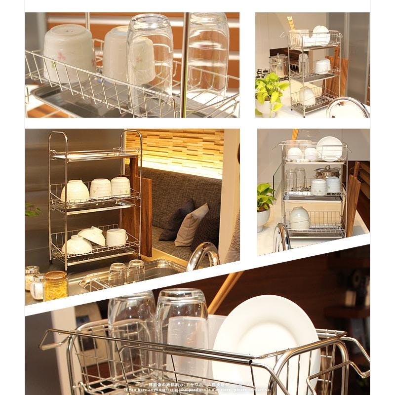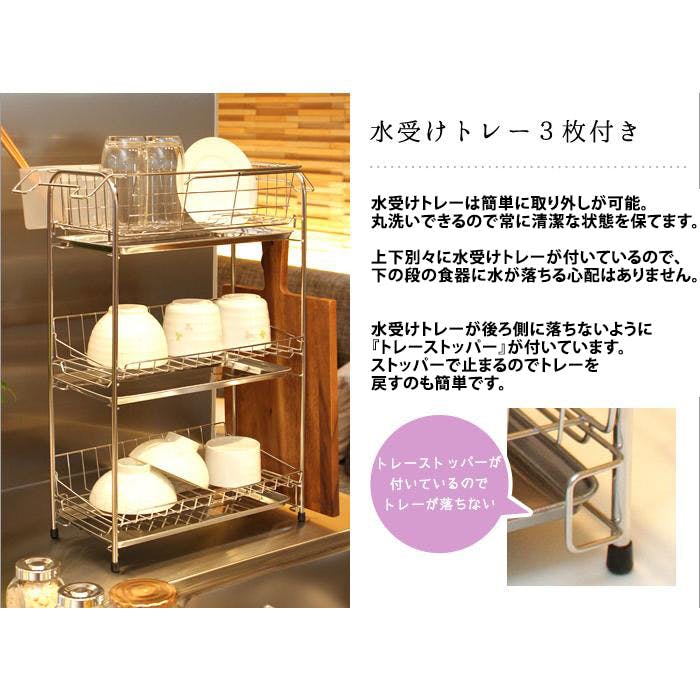 3段式だから省スペースにたっぷり収納、工具不要の組み立て簡単な水切りバスケット。上段バスケットだけを外して、シンク用水切りバスケットとしても使用できます。トレーが奥側に落ちないトレーストッパーと水切りポケット・まな板立て付き。 ※まな板立て移動不可