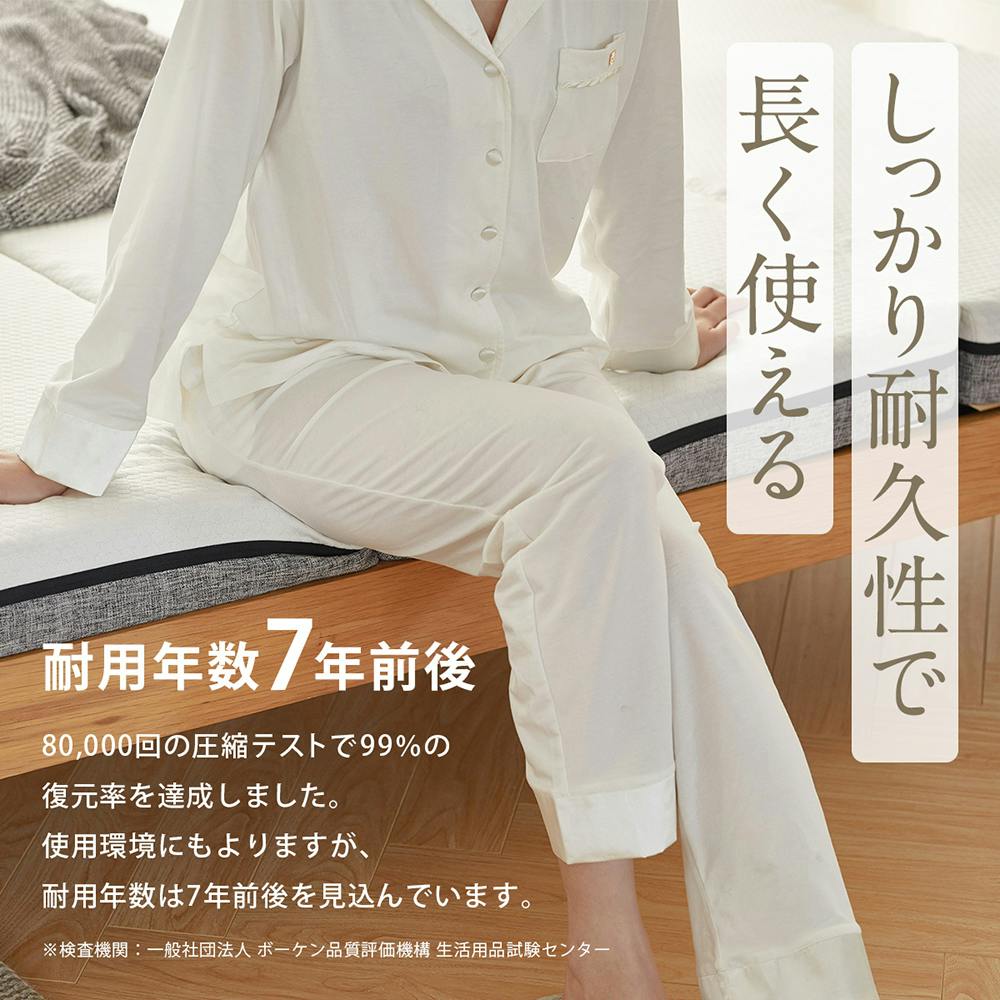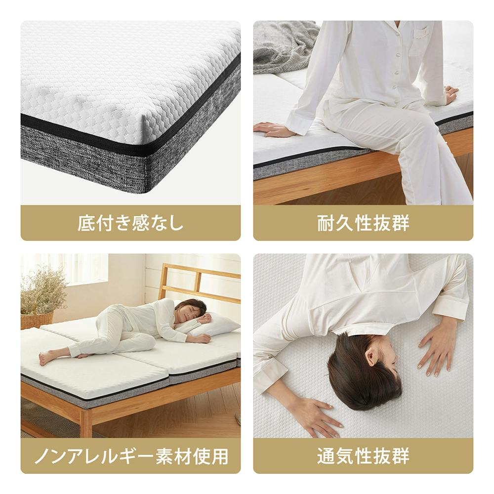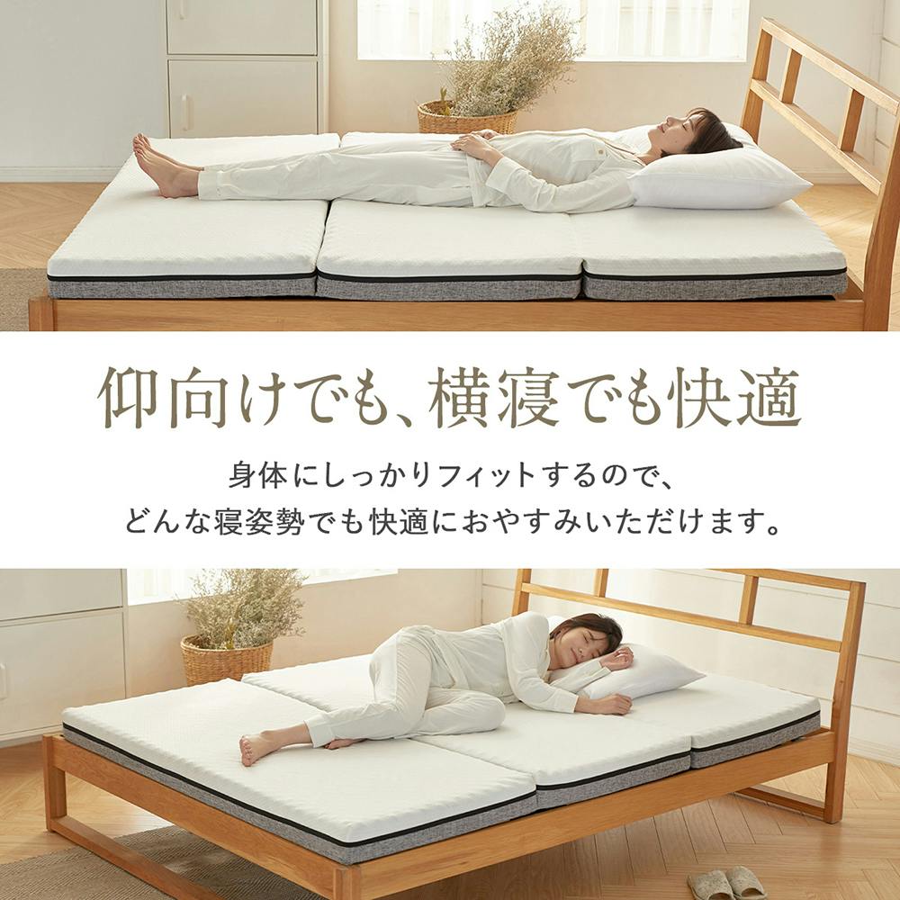 10cmの厚みが身体をしっかり支え、底付き感を抑えて快適な寝姿勢を保ちやすいマットレスです。三つ折り仕様のため扱いやすく、収納や移動も簡単に行えます。体圧を均一に逃がす構造で肩や腰への負担を軽減し、寝返りもしやすくなります。敷布団として単体で使える安心感と、通気性に配慮した快適さを兼ね備え、毎日の睡眠を心地よく整えてくれます。