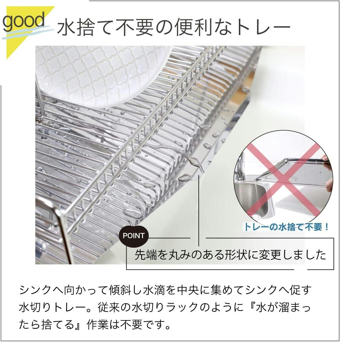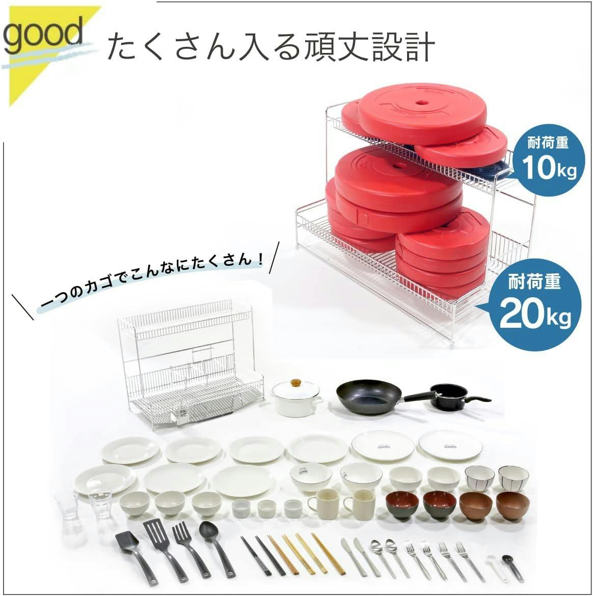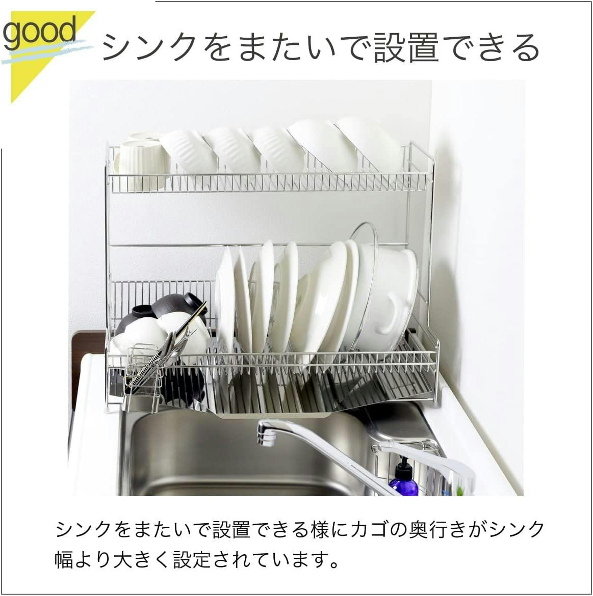 調理スペース広々♪シンクに渡して設置可能、一気に洗い物が片付く2段タイプ、フライパン・大皿の水切りもOK!水を中央へ集めてシンクへ促すトレー&カトラリーケース付き、耐荷重30kgの安心設計、オールステンレスの日本製